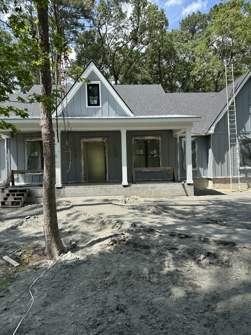 May 7th was a very exciting day at the site as exterior painting started. The color we chose is Sherwin Williams’ African Gray with a white trim. After months of looking at unadorned board and batten, it’s nice to see what our home is ultimately going to look like once construction is complete. The concrete was also poured for the driveway and front walkway. The workers onsite advised that it took for truckloads of cement! The tilework is installed and should be grouted by the weekend. We are planing a weekend Tybee Island beach trip. So we’ll definitely get by the house to see how things are proceeding.