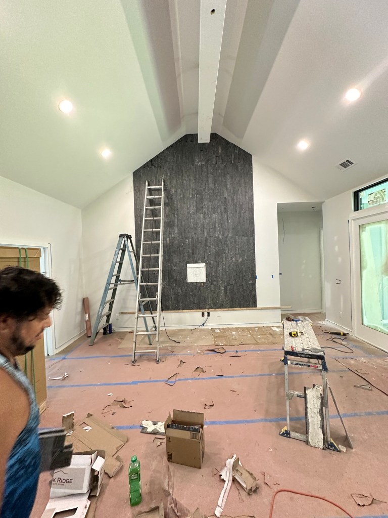 We stopped by the house 7/6 to see how the tile work was progressing. To our surprise, the tile on feature wall was installed. It looks better than we imagined! We were also pleasantly surprised to find the landscaping completed. Next milestone: countertop install on Tuesday!